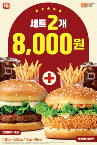 롯데리아가 18일부터 오는 22일까지 5일간 인기 세트메뉴인 새우버거세트와 데리버거세트 함께 구매시 8000원에 제공하는 프로모션을 실시한다고 밝혔다.