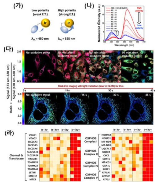 이 유기금속 분자는 외부 빛을 흡수해 활성산소를 만들고, 미토콘드리아 주변의 점도, 극성과 같은 정보가 담긴 새로운 빛을 내도록 설계됐다. 연구진은 개발된 기술을 단백질 분석 기법과 결합해 미토콘드리아 산화가 세포사멸로 이어지는 경로를 제시했다.