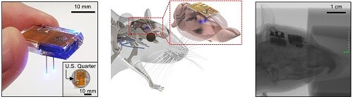 연구팀은 이 기기를 LED 탐침이 쥐의 뇌에 삽입된 상태에서 두피 안으로 완전히 이식하고 쥐가 자유롭게 움직이는 상태에서 배터리가 자동으로 무선 충전될 수 있음을 확인했다.