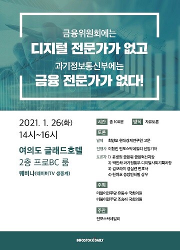 이날 토론회는 ‘금융위원회에는 디지털 전문가가 없고, 과기정보통신부에는 금융 전문가가 없다’는 주제로 진행되며 더불어민주당 유동수 의원과 조승래 의원이 주최하고, 투자정보 전문 미디어 인포스탁데일리가 주관한다.