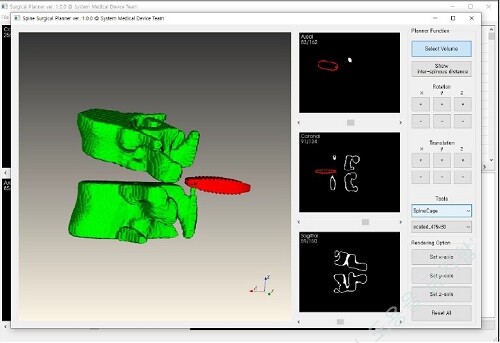 개발된 소프트웨어는 환자 CT 등 의료영상을 바탕으로 척추 영역만 분할해 3차원으로 재구성한다. 재구성된 3차원 영상을 바탕으로 척추에 넣을 ‘인공디스크’를 삽입하기 좋은 위치도 확인하고, 최적의 높이도 시뮬레이션해 볼 수 있다. 또한, 척추를 고정할 ‘척추경 나사못’의 깊이나 각도도 상하좌우로 변경하여 수술계획을 세울 수 있다.