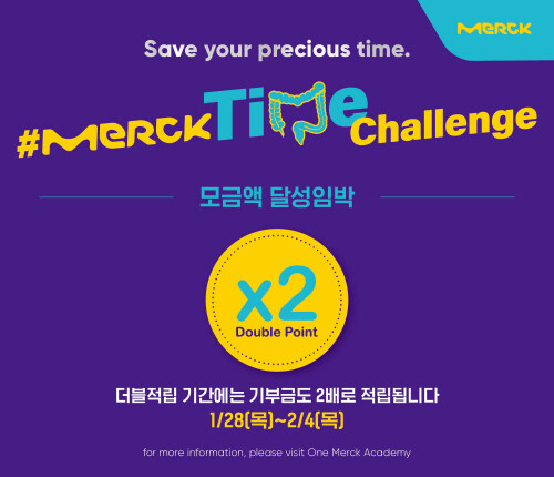 한국머크 바이오파마는 세계 암의 날(2월 4일, World Cancer Day)을 앞두고 암 환우 지원 기금을 모으기 위한 ‘머크 타임 챌린지(MERCKTime Challenge)’의 더블 적립 이벤트를 28일부터 오는 2월4일까지 1주일간 진행한다고 밝혔다.