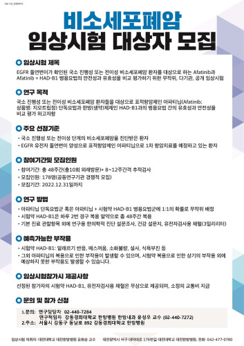 이번 임상 연구는 무작위배정 연구로, 국소 진행성 또는 전이성 비소세포 폐암을 진단받고 EGFR 유전자 돌연변이 양성으로 아파티닙을 1차 항암치료로 예정하고 있는 자가 그 연구대상이다. 2022년 12월 31일까지 다기관에서 총 178명을 모집할 예정으로 총 48주간 10회의 외래방문과 8~12주 간격의 추적검사가 이루어지게 된다.