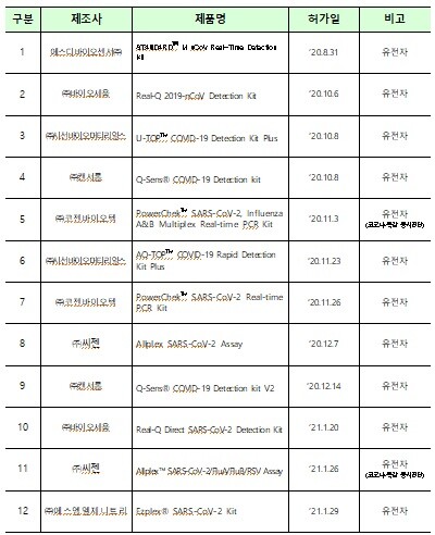 현재까지 12개 유전자진단시약이 정식 허가되었으며 긴급사용 승인된 확진용 7개 진단시약을 충분히 대체 가능하여 2월 3일자로 긴급사용을 종료하게 됐다.