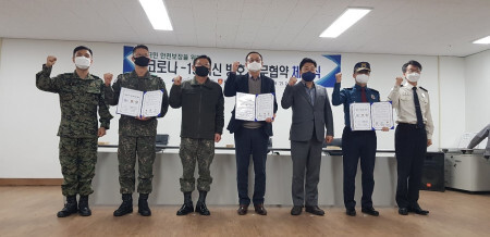 | ▲좌측부터 제3공수여단장, 제3901부대장, 제55보병사단장, 양원석 대표이사, 이천시장, 이천경찰서장, 이천소방서장 (사진=지트리비앤티 제공) |