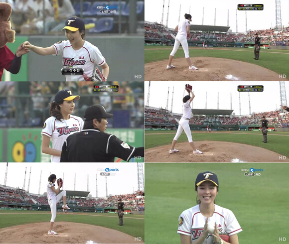 타이트한 트레이닝복과 KIA 타이거즈 유니폼을 입고 등장한 이수정은 프로 못지않은 완벽한 동작으로 멋진 시구를 선보여 관객들의 많은 환호를 받았다.