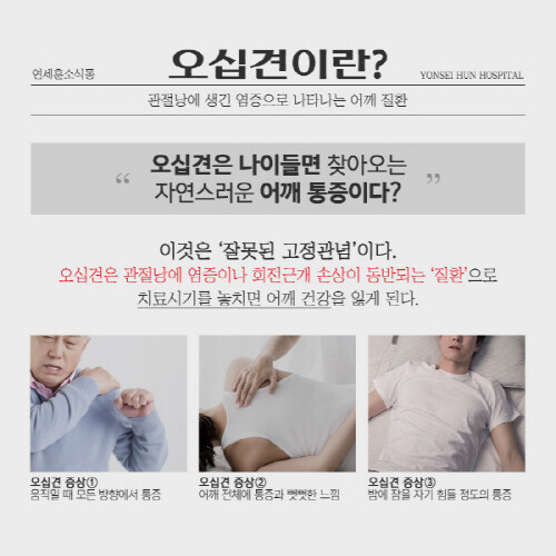 어깨관절에서 회전근개 파열과 함께 가장 인지도가 높은 질환인 만큼 비교적 치료 정보에 대한 습득도 수월하다. 다만 대부분의 치료 정보의 성격이 다양한 양상으로 나타나는 오십견 질환의 특성을 고려한 자세한 안내보다 정의와 증상 그리고 보존적 치료에 국한되어 있다는 점에서 종종 조기 진단, 치료의 시기를 놓치는 원인이 되고 있다.