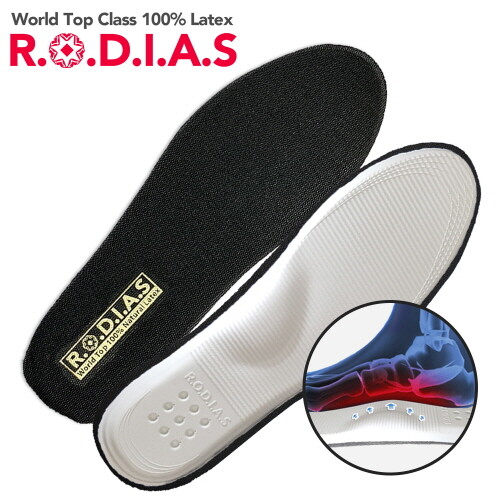 로디아스 라텍스 깔창은 아치서포터가 있는 아치 깔창이다. 아치서포터가 족저근막을 탄력 있게 서포트 하고, 인체공학 설계를 통해 최적의 뒤꿈치 하중을 분산한다. 또한 슈퍼 소재를 첨가해 발에 전달되는 충격을 흡수할 수 있다.