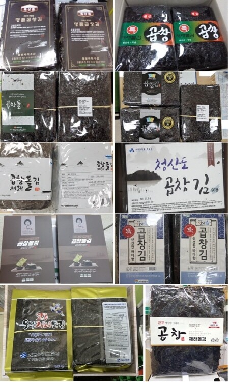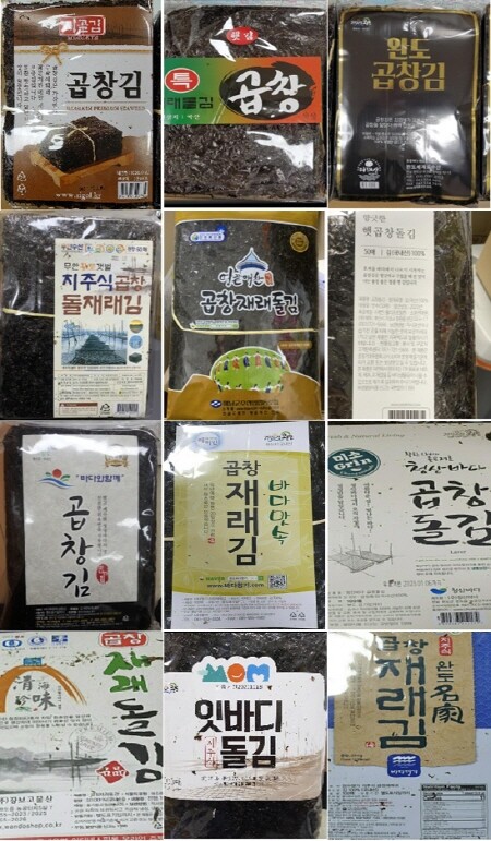부적합 제품은 ▲빛바다수산 ‘명품 곱창김’ ▲명화수산 ‘특재래 돌김 곱창’ ▲세양수산 ‘곱창돌김’ ▲한려원 ‘완도,신안 명품 햇 곱창 재래돌김’ ▲경천식품 ‘시골김 곱창김’ ▲한려원 ‘완도,신안 명품 햇 곱창 재래돌김’ ▲누리원 ‘지주식 남도 특품 햇 곱창김’ ▲완도세계로수산 ‘완도 곱창김’ ▲티엠코리아 ‘특품 곱창김’ ▲바다원 ‘곱창 재래 돌김’ ▲무안수산경영인김양식영어조합법인 ‘지주식 곱창돌재래김’ ▲해남군수산업협동조합 ‘곱창 재래 돌김’ ▲석하 ‘곱창돌김’ ▲라온영어조합법인 ‘아라온 곱창김’ ▲남포물산 ‘파래가 들어있는 진도 재래식 곱창돌김’ ▲바다와함께 ‘바다와함께 곱창김’ ▲대한물산 ‘특 곱창김’ ▲바다향기 ‘바다향기곱창재래김’ ▲청산바다 ‘청산바다곱창돌김’ ▲장보고물산 ‘곱창 재래돌김’ ▲완도맘영어조합법인 ‘잇바디돌김’ ▲세종물산 ‘완도명가지주식 곱창재래김’ ▲새우표 완도물산 ‘새우표 곱창 재래돌김’ ▲고흥군수산업협동조합 ‘우주 재래돌김’(일반김) ▲강수산 ‘마른김’(일반김) ▲환희수산 ‘마른김’(일반김) 등이다.