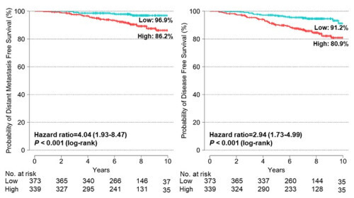 본 연구를 통해 도출된 고위험군의 10년 내 무원격전이 생존율은 기존 검증 연구(Gong et al, 2017)의 고위험군 10년 내 무원격전이 생존율인 73.7%보다 높은 수준이었다. 이는 기존 검증 연구에서는 항암화학치료를 받지 않은 환자군만을 대상으로 한 것과는 달리 본 연구에서는 전향적으로 구축된 환자군을 활용하는 과정에서 이미 항암 화학치료를 받은 환자가 고위험군 전체 중 87.8%으로 다수 포함됐다.