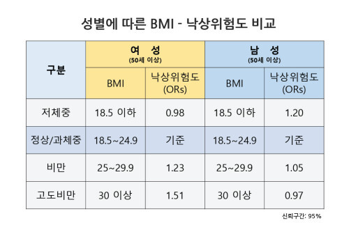 여성은 BMI가 25~29.9(아시아인 기준, 비만)일 때 낙상위험이 23% 증가했으며, 30(아시아인 기준, 고도비만) 이상인 경우에는 51% 증가했다. 반면 남성은 저체중(BMI 18.5 이하)일 때 낙상위험이 20% 증가했다.