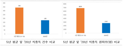 | ▲5년 평균 및 2020년 식중독 건수 비교 (그래프=식약처 제공) |