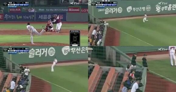 이는 경기 5회 초에 벌어진 것으로 넥센 박병호 선수가 친 타구가 좌측 관중석 쪽으로 날아간 가운데 안타가 된 공을 한 관중이 글러브를 사용에 공을 낚아채 간 것.