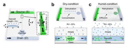 액체 속에 포함된 시료가 액체가 흐르는 방향에 따라 한곳에 모이거나 확산하게 되는 원리다. 나노슬릿 관 높이는 수 나노미터(10-9m)로 낮은 반면 단면 길이는 마이크로미터(10-6m) 단위로 길어 증발로 인한 유체 흐름 변화를 극대화할 수 있다.