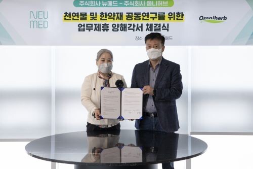천연물 연구개발기업 뉴메드는 최근 의약품용 한약재를 전문적으로 유통하는 옴니허브와 MOU를 체결했다고 5일 밝혔다.