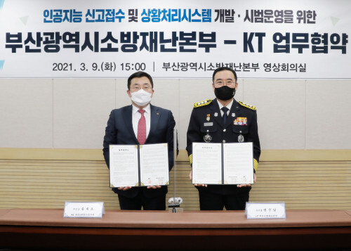 KT가 지난 9일 부산소방재난본부와 ‘인공지능(AI) 119신고접수시스템 개발과 시범운영’을 위한 업무협약을 체결했다고 10일 밝혔다.