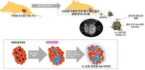 연구팀은 특수 망간나노 입자를 개발하고, 이를 적용하여 줄기세포의 표적 모니터링이 가능한 ‘인테그린 β1 항체(MnOHo-Ab)’를 제조했다. 그리고 자기공명영상장치를 이용하여 전임상에서 이식된 인간 줄기세포의 최소 침습적 모니터링 방법을 개발했다.
