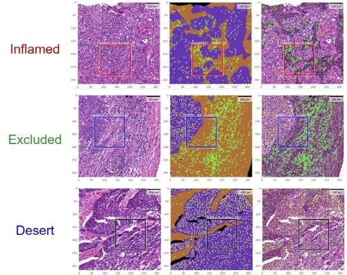 | ▲암조직 종양침윤림프구 분포에 따라 세 가지 면역학적 형질(3-IP)로 분류된 모습 - (위에서부터) 면역 활성, 면역 제외, 면역 결핍: 면역학적 형질에 따라 환자의 면역항암제 반응 및 생존율이 달라질 수 있다. (사진=루닛 제공) |