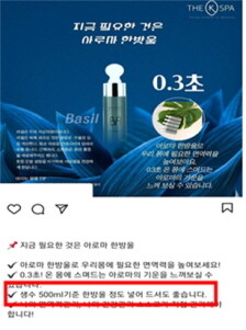 또한 통신판매업 C업체(서울 서초구 소재)는 A업체가 운영하는 대리점 등을 통해 해당 제품을 구매하고 인터넷 쇼핑몰에 게시하면서 ‘생수에 2~3방울을 첨가해 마시는 식품첨가물’로 여성갱년기, 폐경기, 우울감, 고혈압 등 질병 치료에 효과가 있는 것처럼 거짓 광고했고 식약처는 즉시 해당 사이트를 차단 조치했다.