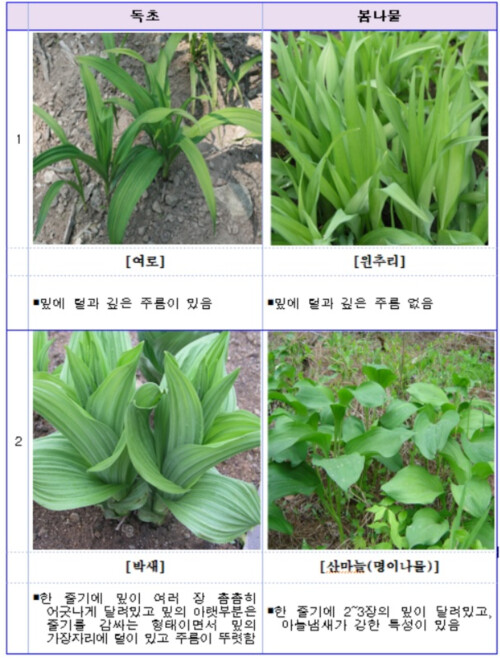 봄에는 꽃이 피기 전 싹이 돋아나는 시기이므로 봄나물과 독초를 구별하기가 쉽지 않다.