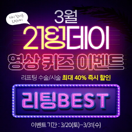 퀴즈 내용은 브랜드필름 영상 속 메시지 중 해당하지 않는 것을 고르는 것으로 정답을 맞추면 리프팅 BEST 수술/시술 최대 40% 할인 혜택을 받을 수 있다.