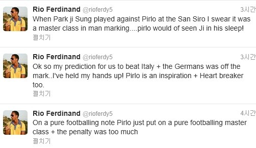 이에 경기 이후 퍼디낸드는 자신의 트위터를 통해 “우리(잉글랜드)가 이탈리아를 이길 거라 예상했는데..”라며 “피를로가 최상급의 플레이를 보여줬다. 특히 승부차기에서는 더욱 그랬다. 피를로는 자극을 주는 선수다”라는 글을 게재해 피를로에 극찬을 했다.