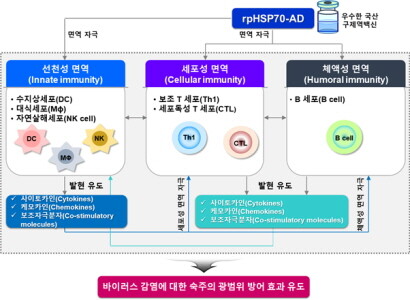 새로 개발된 면역강화제(rpHSP70-AD)는 선천성·적응성 면역반응의 연결고리 역할을 하는 돼지-유래 열 충격 단백질과 구제역 바이러스의 방어 관련 주요 단백질 및 다양한 면역강화 분자들을 결합했다.
