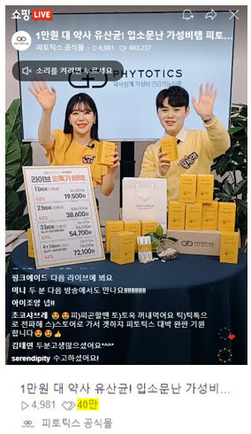 이번 피토틱스 쇼핑라이브에선 건강기능식품 구매를 망설이는 고객들의 현실적인 고민을 재치 있는 상황극과 라이브 커머스 특유의 생동감을 두 MC가 잘 살려내며 실시간 댓글 문의에 발 빠르게 대응했다. 이에 방송 60분만에 시청자 수 약 4000명 이상의 시청자수를 기록하고 누적 좋아요 수 40만 돌파라는 기록과 방송 마지막까지 소비자들의 뜨거운 호응으로 마무리됐다.