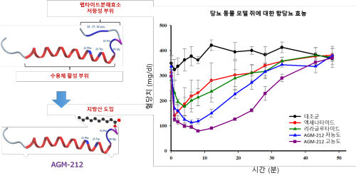 GLP-1 수용체 (Glucagon-like peptide receptor)를 표적으로 하는 약물 (GLP-1, 엑세나타이드)들은 인슐린 분비에 따른 혈당 강화 효과와 식이조절을 통한 체중감소 효과를 통해 비만과 당뇨병 치료제로서 주목받고 있다. 오리지널 엑세나타이드와 비교하여 이들 엑세나타이드 변형체 (AGM-212, AGM-215, AGM-216, AGM-217)는 약 5-10배 이상 증가된 약효 지속시간을 가진다.