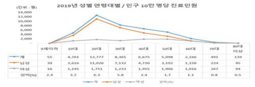 | ▲2019년 성별 연령대별 진료인원 (사진=건보공단 제공) |