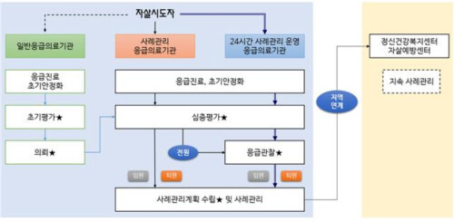 보건복지부는 자살시도자에 대한 사례관리를 위해 2013년부터 '응급실 기반 자살시도자 사후관리사업'을 실시해왔다.