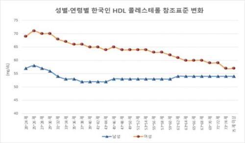 분석 결과, HDL콜레스테롤 참조표준의 경우 전 연령대에서 여성이 남성보다 높은 수치를 보였고, 여성의 경우 연령이 증가할수록 수치가 낮아지는 경향이 있었다.