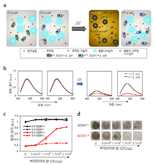 KAIST는 생명과학과 정현정 교수, 화학과 이해신 교수 공동연구팀이 도파민의 반응을 이용해 병원균의 생장과 항생제 내성을 광학적으로 측정하고 맨눈으로 실시간 검출하는 기술을 개발했다고 7일 밝혔다.