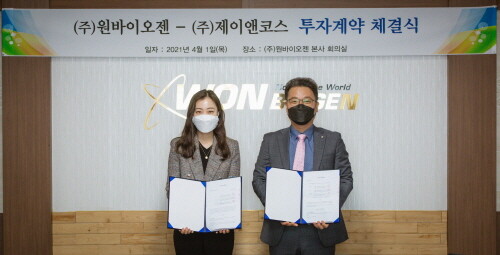 | ▲원바이오젠 김원일 대표이사(우측)와 제이앤코스 김은혜 대표이사(좌측)가 1일 투자계약식 기념 촬영을 진행했다. (사진=원바이오젠 제공) |