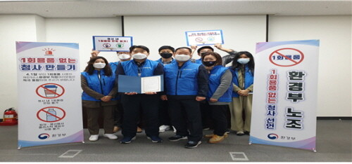 앞서 지난 3월 22일 공공부문의 일회용품 사용을 줄이고 탄소중립 실현에 기여하기 위해 박진천 환경부노조 위원장을 비롯한 노조임원들은 청사 내에서 일회용품을 반입하거나 사용하지 않는다는 실천 사항을 선언했다.