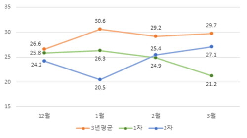 전국 초미세먼지 농도는 24.3㎍/㎥으로 최근 3년(29.1㎍/㎥)간 평균 농도 보다는 약 16%, 1차 기간(24.5㎍/㎥)에 비해서 소폭 개선됐다. 특히 1차 기간 대비 12~1월은 3.8㎍/㎥(26.1→22.3㎍/㎥) 개선됐고 2월은 비슷했다. 다만 3월은 5.9㎍/㎥(21.2→27.1㎍/㎥)로 악화됐다.