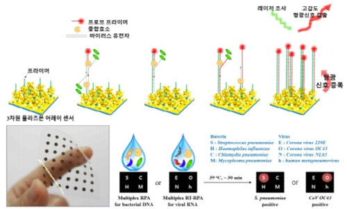 연구팀은 이러한 문제점을 해결하기 위해 세계최초로 분자의 광신호를 수백 배 이상 증폭시킬 수 있는 3차원 금 나노기판 상에 등온 PCR기술을 융합시켜 섭씨 37도의 항온 유지만으로 30분 이내에 호흡기 감염 병원체의