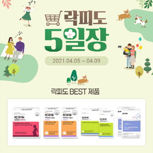 프로바이오틱스, 멀티비타민, 프로폴리스 스프레이, 오메가3, 아연 등 락피도 베스트 제품을 특별한 가격에 만나볼 수 있는 기회로, ‘락피도 5일장’이라는 캐치프레이즈에 걸맞게 매일 색다르고 파격적인 혜택을 제공할 예정이다.