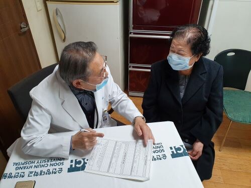 | ▲이용진 센터장이 지역 주민을 대상으로 건강영향조사를 진행하고 있다 (사진= 순천향대 천안병원 제공) |