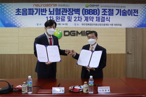 대구경북첨단의료산업진흥재단과 뉴로소나간 ‘초음파 기반 뇌혈관장벽 조절’ 2번째 기술 이전 계약이 지난 8일 진행됐다.