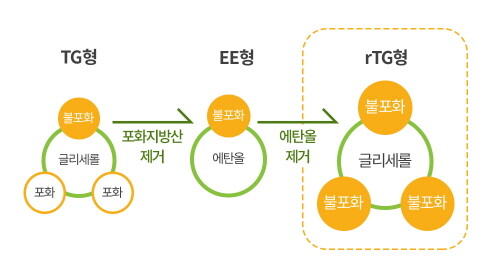 오메가3는 분자구조에 따라 TG, EE, rTG형으로 나뉜다. 1세대 TG형은 지방산 대사를 돕는 글리세롤이 있어 흡수율은 높지만 불필요한 지방산인 포화지방산이 함께 결합돼 있어 순도가 떨어진다. 2세대 EE형은 정제과정을 거쳐 포화지방산을 제거해 순도가 우수하지만, 글리세롤 대신 에탄올 함유로 흡수율이 낮으며, 에탄올은 임산부 및 10세 미만은 섭취에 제한이 있다. 그 중 3세대 rTG형은 글리세롤에 불포화지방산 3개만 붙인 형태기 때문에 자연분자 형태와 유사하고 체내 흡수율과 생체 이용률이 높다는 특징이 있다.