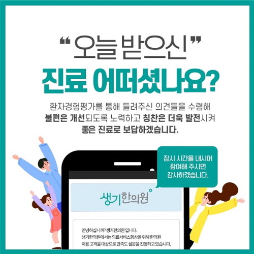 또한 “환자경험평가 모바일 설문지가 도착하면 생기한의원에 대한 솔직한 평가를 꼭 남겨주시길 부탁드리며, 더욱 업그레이드 된 진료서비스로 보답하는 생기한의원이 되겠다”라고 덧붙였다.