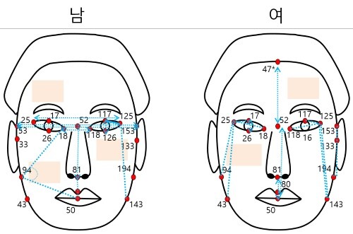 형태 변수는 얼굴에 기준점을 설정한 후 이를 이용해 길이, 각도, 비율, 면적 등을 추출했고, 색상 변수는 영역을 구분해 영역별 밝기 성분, 붉은색·푸른색 등 성분으로 표현되도록 변수를 추출하는 방식으로 이뤄졌다.