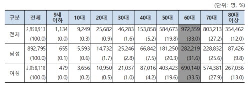 2019년 기준 무릎관절증으로 의료기관을 찾은 진료인원 구성비를 연령대별로 살펴보면 60대가 33.0%인 97만2359명으로 가장 많았고 70대 27.2%인 80만3213명, 80대 이상 12.0%인 35만4462명 순이었다.