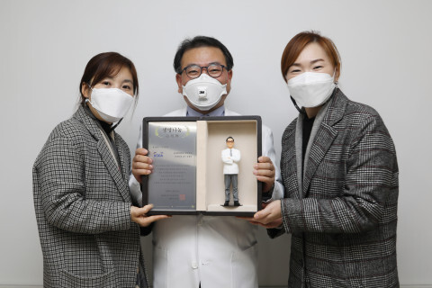 | ▲순천향대천안병원 신경외과 심재준 교수가 한국장기조직기증원으로부터 장기기증 활성화 공로로 '생명나눔 공로상'을 수상했다. 장기기증원 관계자들이 15일 병원을 방문해 특별히 제작한 공로상 겸 피규어를 심재준 교수에게 전달하고 있다. (사진=순천향대천안병원 제공) |