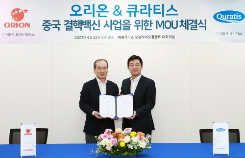 | ▲큐라티스 조관구 대표이사(우), 오리온홀딩스 허인철 대표이사/부회장(좌)이 MOU 계약체결식에서 기념사진을 찍고 있다. (사진=큐라티스 제공) |