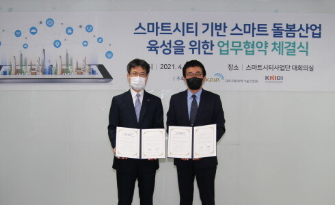 한국보건산업진흥원(KHIDI)과 국토교통과학기술진흥원(KAIA)은 지난 23일 서울 용산 스마트시티 사업단에서 '스마트시티 연계 스마트 돌봄산업 육성'을 위한 업무협약(MOU)을 체결했다고 26일 밝혔다.