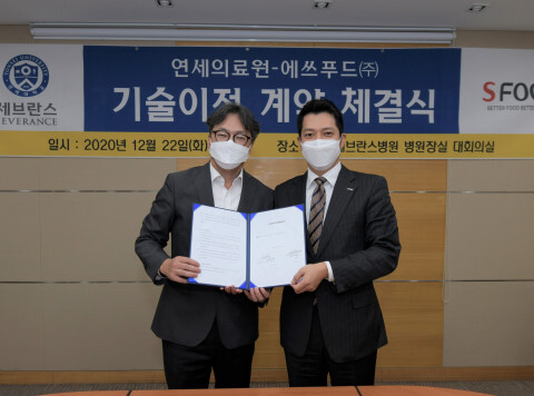 | ▲최재영 연세의료원 산학협력단장(좌)과 조성수 에쓰푸드 대표 (사진=강남세브란스병원 제공) |