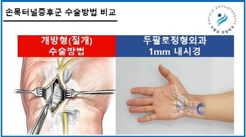 서울 두팔로정형외과 하승주 대표원장은 “병변에 도달하기 위해 광범위한 피부조직 절개와 손상이 불가피한 개방형과 달리 내시경은 병변에 직접 접근이 가능한 터널(포털) 하나만으로 진행된다. 그리고 내시경 직경은 아이에 손톱보다 작은 1mm 직경으로 수술임에도 주변 조직 손상 없이 가능해 통증, 회복 지연, 흉터 부담 없이 빠른 일상복귀가 가능하다”고 설명했다.