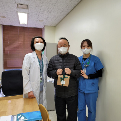 | ▲ 이대목동병원 치과를 찾아준 환자(가운데)에게 사랑의 수제청을 전달하고 있다. 왼쪽은 박은진 이대목동병원 치과진료부 과장, 오른쪽은 박지은 주임 위생사. (사진=이대목동병원 제공) |